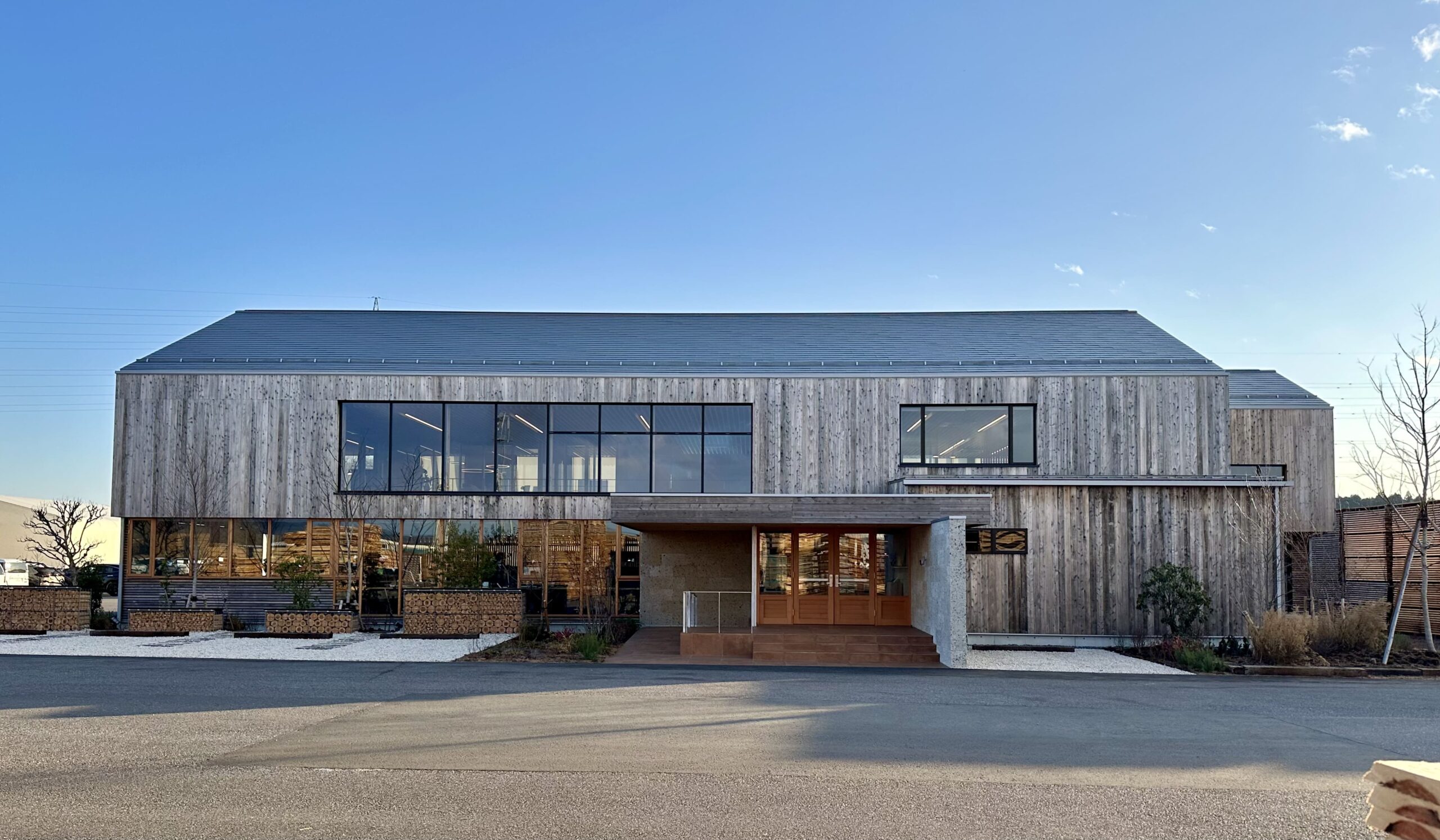 所在地:福島県東白河郡塙町用途:事務所構造・規模:木造 一部 鉄骨造延床面積:651㎡竣工:2025年5月